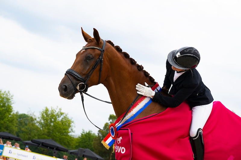Patchouli Vera (Kjento uit Kiara elite IBOP-dres PROK van Bordeaux) won de halve finale en het eerste onderdeel van de finale, daar mocht ze een 9,3 van gastamazone Jessica Lynn Thomas aan toevoegen. “Deze merrie werd een klein beetje onzeker van mij in de zelfhouding, maar deed alles wat ze kon om het goed te doen voor me”, licht ze toe. “Het is echt een superfijn, elegant paard dat makkelijk te rijden is en nergens naar keek in deze ambiance.” Patchouli Vera is een echt familiepaard, ze wordt gereden door Annemijn Boogaard en is gefokt door haar moeder Florine de Voogd en zus Veerle Boogaard. “Dit hadden we nooit verwacht, dit is ons eerste fokproduct. En dat uit mijn eigen merrie, dat is helemaal bijzonder”, aldus Veerle. “Ze is zo’n lief paard en doet altijd echt haar uiterste best”, vult Annemijn aan. “Het is ontzettend leuk dat we alles zelf met haar hebben meegemaakt en heel fijn om een paard te hebben dat altijd voor je wil werken.”