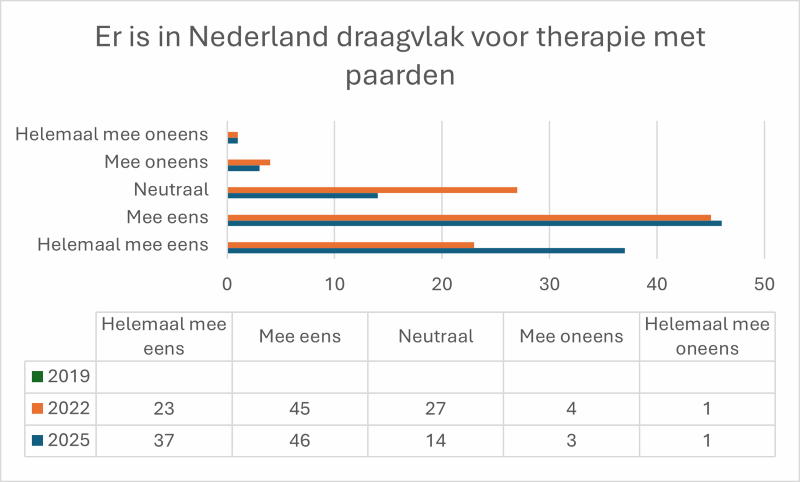 Ook de acceptatie van de therapeutische inzet van paarden laat een duidelijke stijging zien. In 2022 was de neutrale groep nog 27% en de (helemaal) mee eens groep 68%. In 2025 is de neutrale groep afgenomen naar 14% en zien we een stijging bij de (helemaal) mee eens groep van 83%. Kortom de neutrale groep is kleiner geworden en meer mensen spreken zich uit en doen dat positiever dan voorheen.