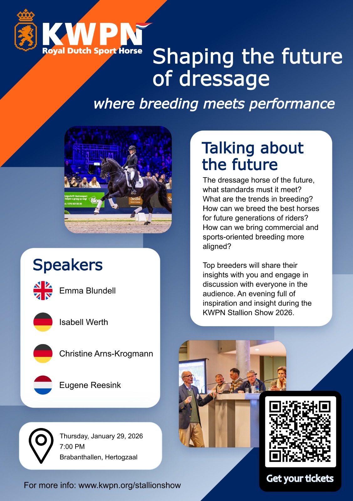 Het dressuurcongres vindt plaats op donderdag 29 januari 2026 in de Brabanthallen in Den Bosch (Hertogzaal). De inloop is vanaf 19.00 uur, het congres start om 19.30 uur. De voertaal is Engels. Het congres maakt deel uit van de KWPN Stallion Show, die van 28 tot en met 31 januari 2026 wordt georganiseerd. Voor het dressuurcongres zijn losse tickets verkrijgbaar.